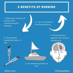 With events cancelled the motivation and enjoyment derived from achieving a goal related to an event are not currently attainable. Now is a good time to reflect and focus on the many known health benefits of running. Concentrating on these benefits can serve as a sustainable source of motivation. Some of the many known benefits are captured in the below infographic.