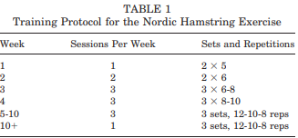 A 2011 study analysed the effects the nordic hamstring exercise had on lowering the incidence of hamstring injuries in soccer (2). The study took amateur, semi-professional and professional players from the top 5 Danish football leagues and after applying their methodology, resulted in a total of 461 players in the intervention group and 481 in the control group (2). The intervention group completed NHE as per table 1.
