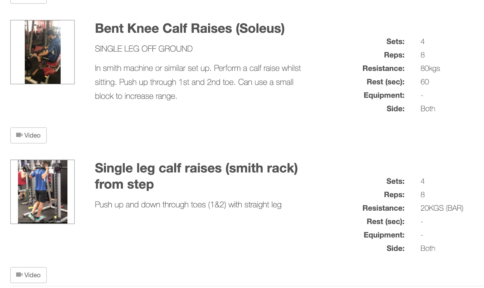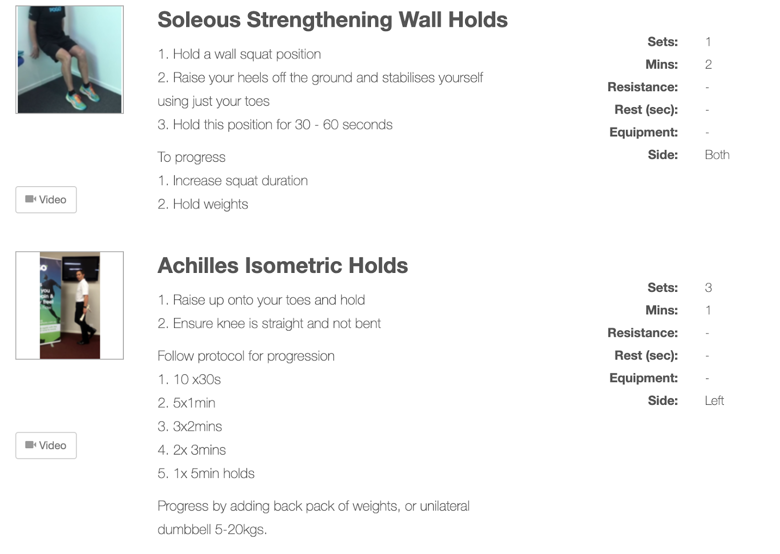 Exercises are demonstrated and prescribed via our exercise prescription software and app TrackActive. Trackactive has viewable videos and photos, as well as detailed commentary on how to complete the exercises with accuracy at home or the gym. See below for an example series of exercises: